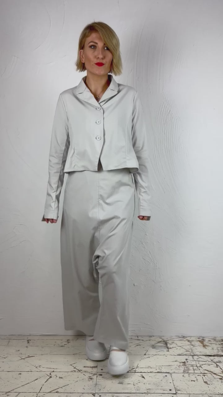 Light and stretchy trousers with exaggerated high waistline and low crotch.