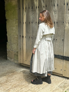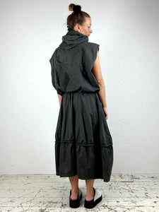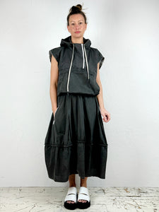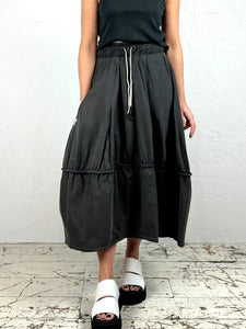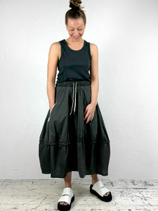 THE DESCRIPTION: Enjoy a sporty-chic look this season with this light coated cotton fabric skirt with white contrast details. Featuring a voluminous design and an elasticated waistband with stylish white drawstrings. The hem finishes at a playful midi-length, hitting just at the shin for a unique touch. Visible white zip detail to one side.