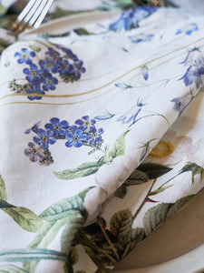 Set a beautiful table with this stunning blue flower garden tablecloth in high-quality stone-washed linen. This eye-catching design is made from naturally grown flax and printed with environmentally friendly ink, featuring motifs of enchanting bellflowers, charming white roses and beautiful butterflies.