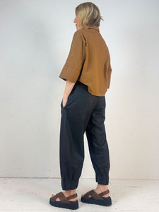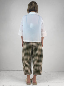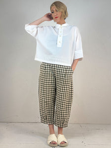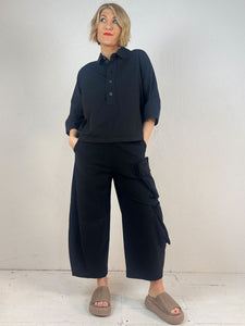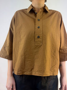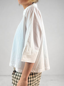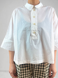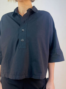 Plain top with short sleeves, made from fine cotton poplin. Inspired by a jacket, it is distinguished by its shirt collar, its wide polo tab and its visible buttons. It's kimono sleeves and wide hem at the bottom of the sleeves add a touch of comfort and relaxed elegance.