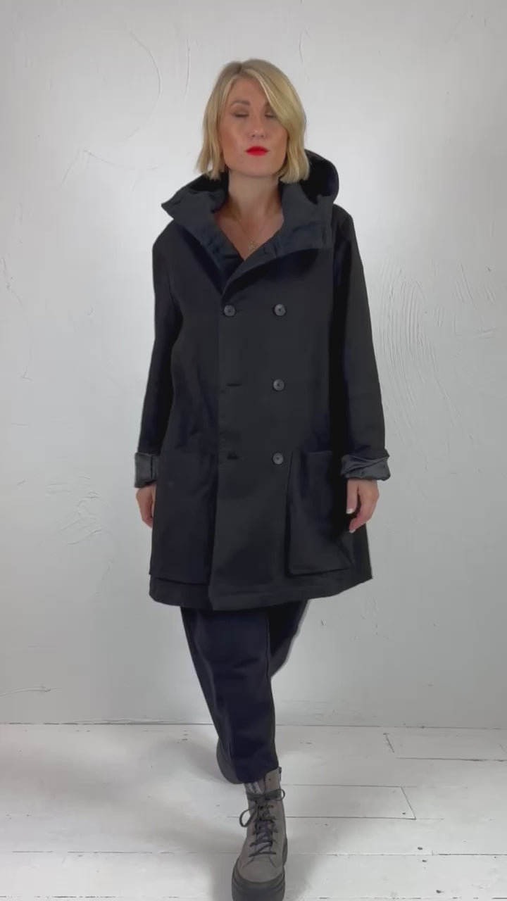 This double breasted jacket features a contemporary design with a straight cut, a warm fleece lining, fleece lined hood and convenient pockets. Nice thick, cosy heavy fabric to protect you from the elements and an overall androgynous , oversized look.